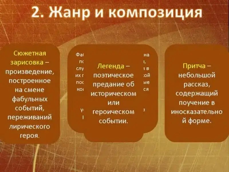 (7 слайд) У.:- "Анчар" - сюжетная зарисовка, основанная на легенде, с философской проблематикой, которой соответствует жанр притчи. Композиция позволяет проследить за развитием авторской идеи и строится на основе антитезы. Сюжетная зарисовка - произведение, построенное на смене фабульных событий, переживаний лирического героя. Фабула - фактическая сторона повествования, те события, случаи, действия, состояния в их причинно-хронологической последовательности, которые компонуются и оформляются автором в на основе закономерностей, усматриваемых автором в развитии изображаемых явлений. Легенда - поэтическое предание об историческом или героическом событии. Притча - небольшой рассказ, содержащий поучение в иносказательной форме.