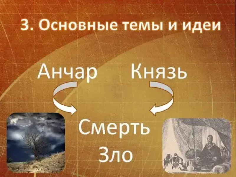 У.:- Главная тема стихотворения - мировое зло, которое рассматривается как с философской, так и с социальной точки зрения. Пушкин рисует образ зла как вечную проблему человеческого существования на земле. Его символом становится "древо смерти" - анчар. С ним соотносится философская проблема жизни и смерти. Вместе с тем поэт обращается в этом стихотворении к важнейшей теме, проходящей через все его творчество, - теме свободы и тирании, но раскрывает ее в общефилософском плане, что было характерно для его поэзии зрелой поры. В "Анчаре" Пушкин представляет свой взгляд на ту систему, где существует неограниченная власть одного человека (князя или царя) над другим. Поэт видит в самой ее сущности источник зла и раскрывает эту важную идею всем ходом стихотворения. (слайд 9)