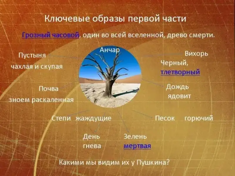 - Назовите Стихии природы, которые, приходя с Анчаром в соприкосновение, делаются разрушительными. Ветер, сталкиваясь с деревом смерти, получает страшное название "вихорь черный" и, пролетая мимо него, становится носителем зла.