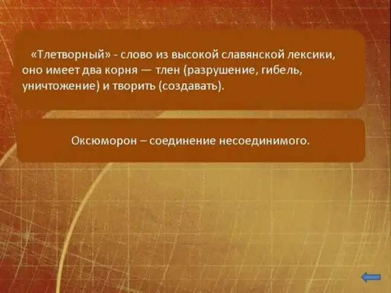 - Что значит слово "тлетворный"? (гиперссылка) Оно из высокой славянской лексики имеет два корня - тлен (разрушение, гибель, уничтожение) и творить (создавать).