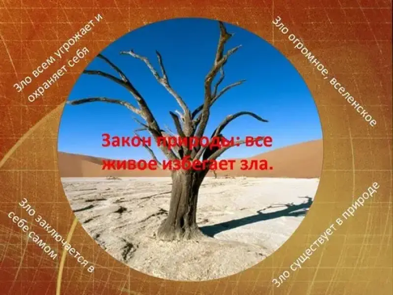 (13 слайд) Вывод: "Зло всем угрожает и охраняет себя, зло огромное, вселенское, зло заключается в себе самом, зло существует в природе". Закон природы: все живое избегает зла.