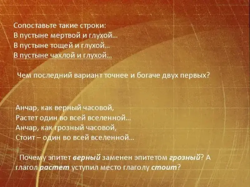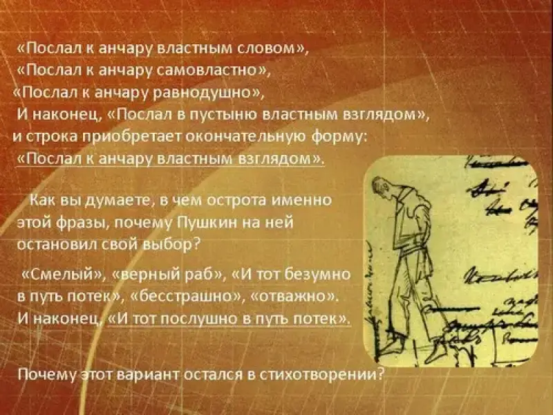 - Но почему мог человека человек послать к анчару? Начинаются поиски следующей строки: "Послал к анчару властным словом", "Послал к анчару самовластно", "Послал к анчару равнодушно", И наконец, "Послал в пустыню властным взглядом", и строка приобретает окончательную форму: "Послал к анчару властным взглядом".