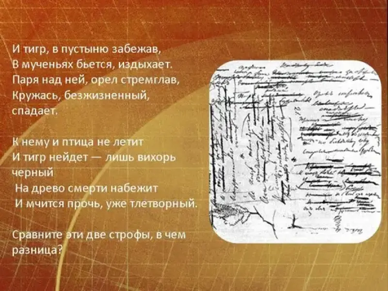 (14 слайд) У.:- Пушкин упорно и тщательно работал над стихотворением: сохранилось более 200 поправок и вариантов к нему. Сопоставьте такие строки: