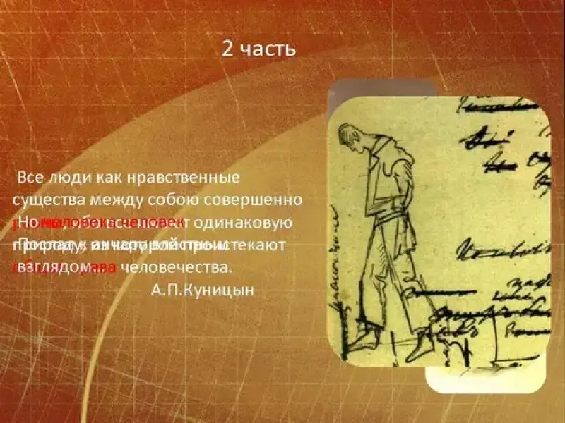 (16 слайд) У.:- А.П.Куницын говорил: "Все люди как нравственные существа между собою совершенно равны, ибо все имеют одинаковую природу, из которой проистекают общие права человечества". Как вы понимаете это высказывание?