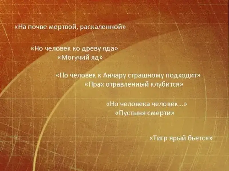 (17 слайд) - В черновиках этого стихотворения видно, как долго Пушкин искал подходящее слово, позволяющее выразить всю противоестественность такого социального устройства. Пушкин находит, отбрасывает, отыскивает все более резкие и напряженные детали, рисуя страшную картину смерти и гибели, которые окружают ядовитое дерево: "На почве мертвой, раскаленной", "могучий яд", "прах отравленный клубится", "пустыня смерти", "тигр ярый бьется". Но картина эта важна ему не сама по себе. Значение ее в том, что к страшному дереву идет человек. Возникает первый набросок: " Но человек ко древу яда" и далее: "Но человек к Анчару страшному подходит" и сейчас же возникает следующая запись, та, в которой содержится весь идейный смысл стихотворения "Но человека человек В пустыню посылает". (18 слайд)