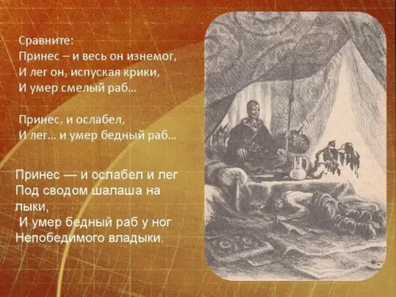- Какие старославянизмы и архаизмы использует поэт при описании раба? (хладный, ветвь, чело) придают строфе трагическое звучание: вернувшийся раб смертельно болен.
