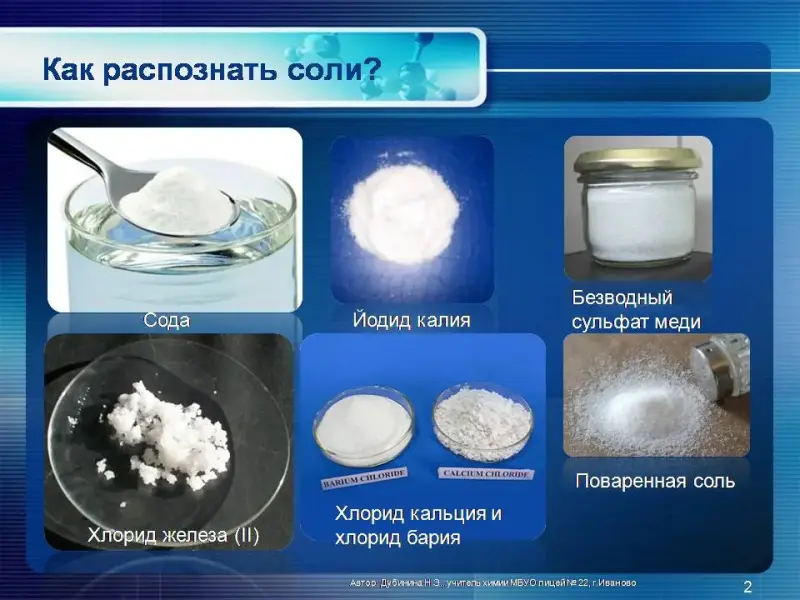- NaCl, FeCl2, CuSO4 и т.д.