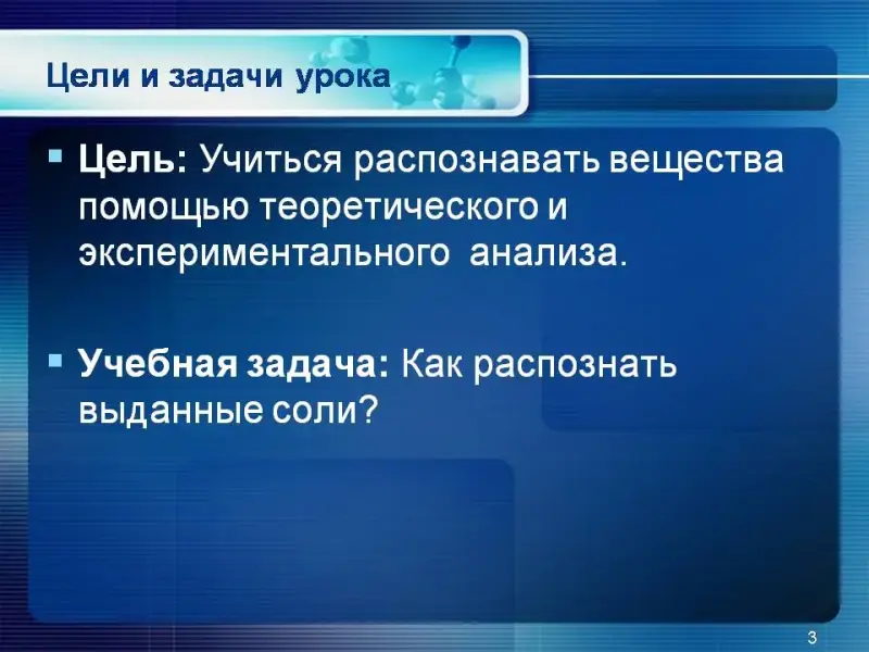 Цель: Учиться распознавать вещества помощью теоретического и экспериментального анализа (слайд 3).