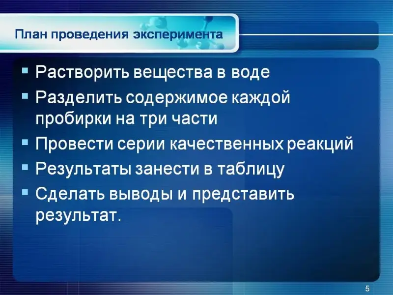 Содержание. Перед экспериментом проводится теоретический этап исследования: выдвижение гипотез о способах распознавания веществ в пробирках, составление схем анализа.