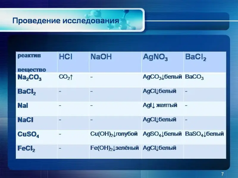 - Для тех, кто хочет провести теоретическое исследование, записать уравнения реакций в молекулярном и ионном виде и заполнить аналогичную таблицу для веществ: FeCl3, Na2CO3, Ba(NO3)2, NaOH, H2SO4