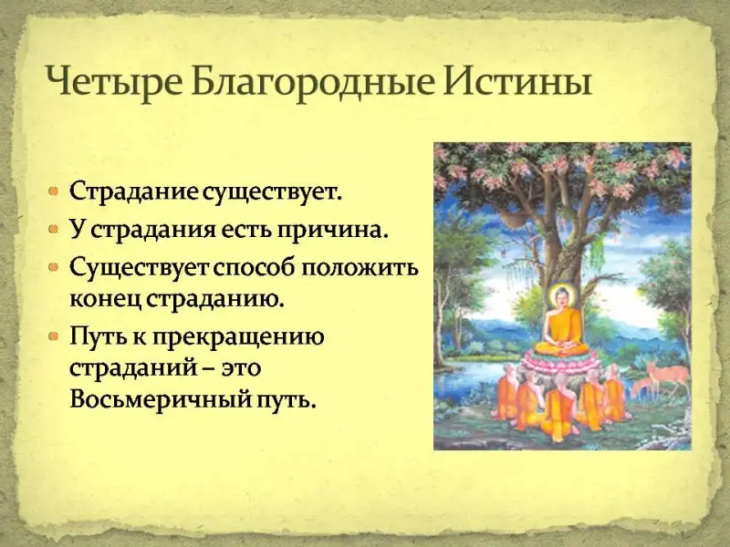 2. Вспомните Четыре Благостные Истины, сформулированные Буддой в своей первой проповеди в Сартане (страдание существует, у страдания есть причина, существует способ положить конец страданию, путь к прекращению страдания - это Восьмеричный Путь).