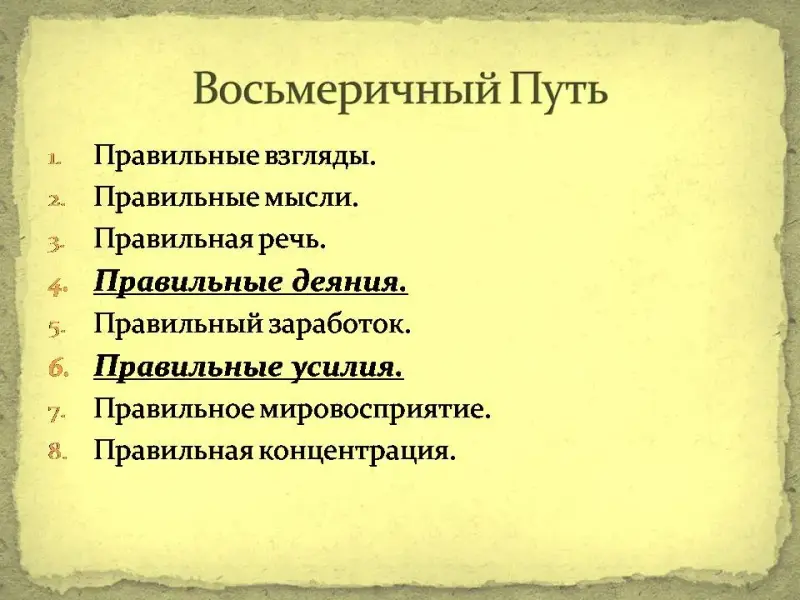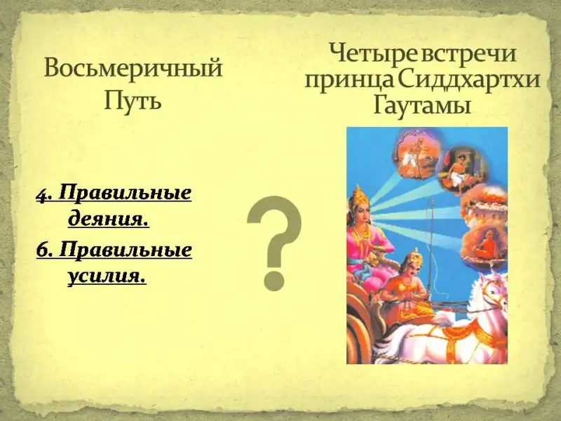 3. Соотнесите выделенные пункты Восьмеричного Пути с иллюстрацией в учебнике на странице 9. Что общего между ними? (человек, жизнь человека)