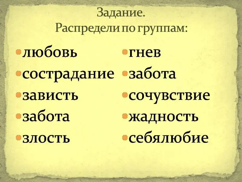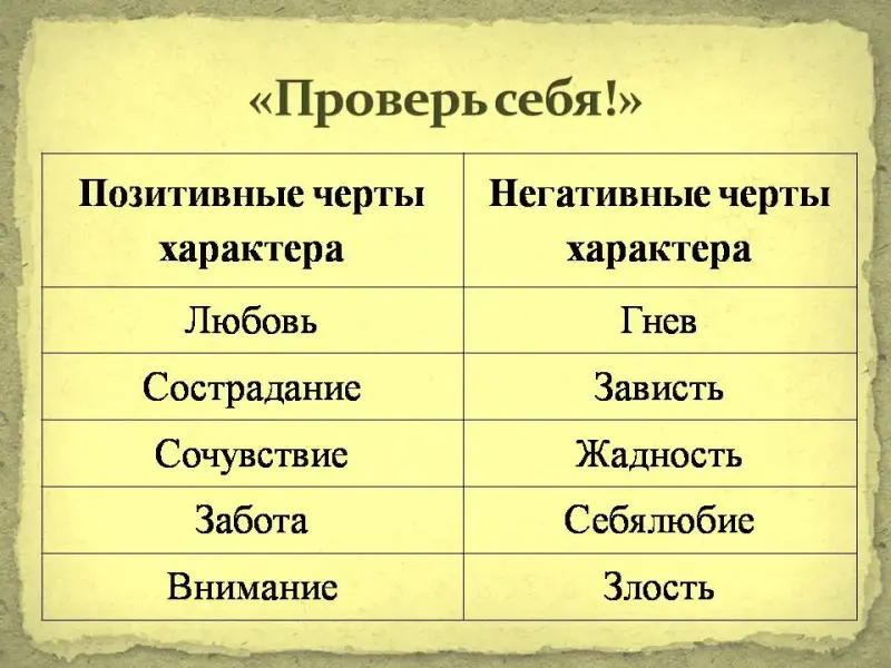 1. Инструктаж. У каждого человека есть позитивные и негативные качества, черты характера. Ваша задача состоит в том, чтобы распределить написанные на карточках слова по двум группам: первая группа - позитивные черты характера, вторая группа - негативные. Кроме того, необходимо привести 2-3 примера (вспомнить 2-3 ситуации из жизни или художественной литературы).