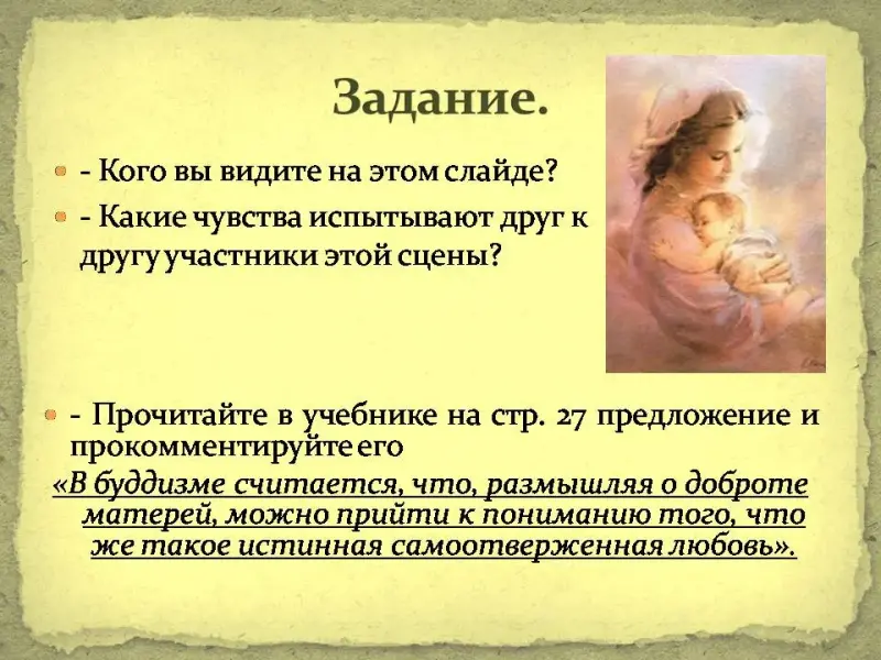 - Прочитайте в учебнике на странице 27 предложение и прокомментируйте его («В буддизме считается, что, размышляя о доброте матерей, можно прийти к пониманию того, что же такое истинная самоотверженная любовь»). Обучающиеся высказывают своё мнение.