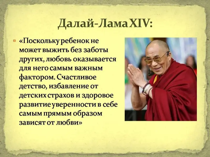 Подумайте над словами Далай-Ламы XIV: «Поскольку ребенок не может выжить без заботы других, любовь оказывается для него самым важным фактором. Счастливое детство, избавление от детских страхов и здоровое развитие уверенности в себе самым прямым образом зависят от любви».