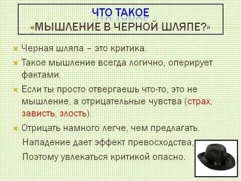 б) (слайд 8): девочка не стала огульно критиковать высказывание ученика, а сначала подчеркнула то, что было правильно, потом доказала, в чем была ошибка. Дети заключают, что для нее подходит черная шляпа, и ученику, который ошибся, ее высказывание не так обидно, зато он поймет, в чем его ошибка.