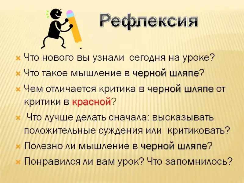 Урок, конспект и презентация к которому здесь представлены, является первым уроком темы «Черная шляпа -критическое мышление». Перед этим изучались темы: «Общее представление о мышлении человека», «Белая шляпа - помощь логики», «Красная шляпа - эмоции и чувства». На следующем после представленного уроке планируется разбирать примеры использования критического мышления, а также примеры ответа на критику без погружения в отрицательные эмоции. Последующие темы: «Желтая шляпа - позитивное мышление», «Зеленая шляпа - творческое мышление» и, наконец, «Синяя шляпа - управление мышлением», в ходе изучения которой отрабатывается умение задавать собеседнику правильные вопросы, а также делать обобщения и выводы.