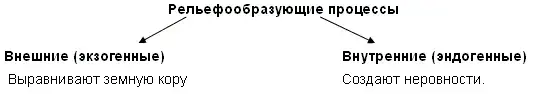 Рельеф земной коры создан при взаимодействии внешних и внутренних процессов, проявляющихся на нашей планете. Давайте запишем схему.