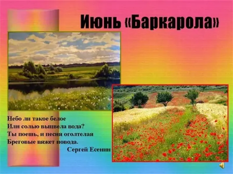 Вот и наступило лето. О чём же рассказывает музыка "Июня"? П. И. Чайковский назвал пьесу "Баркаролой". Слово это родилось в Италии, и переводится оно "лодочная" или "песня в лодке", потому что "барка", по-итальянски и означает "лодка". Тот, кто пробовал петь в лодке на озере, море знает, что голос на воде звучит особенно звонко и песня разносится далеко-далеко.