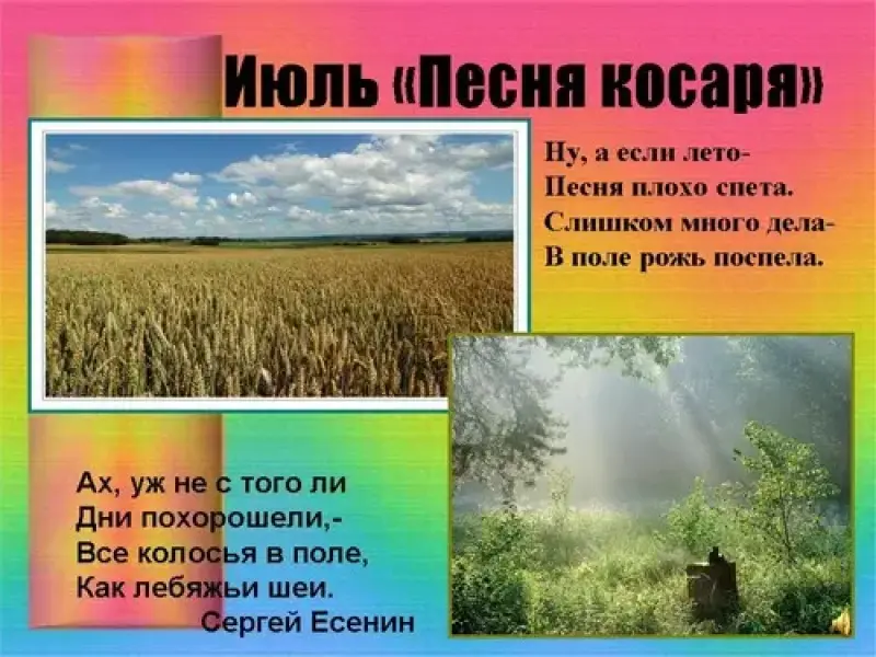 Музыка "Июля" рассказывает о работе. И вместе с тем это ещё одна песня - композитор назвал её "Песня косаря". Она мужественная и энергичная. Идут по полю косари. Ослепительно вспыхивают на солнце лезвия из кос. А шаг под песню становится особенно ладным, ровным у всей шеренги косарей.