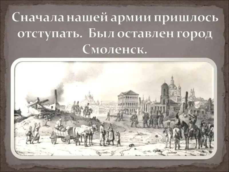 Удар французов был настолько силён, что русские войска не смогли сдержать натиск противника. Русская армия начала отступление. Французы во главе с Наполеоном теснили нашу армию в сторону Москвы. Для Наполеона было делом чести войти в российскую столицу. Позади вражеское войско оставляло сожжённые деревни и сёла, разграбленные города.