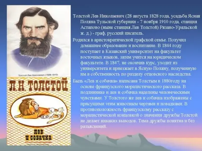 Цель: Ознакомить с произведением Л.Н.Толстого "Лев и собачка"