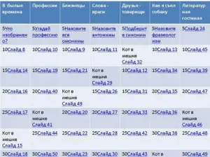 Перед вами игровое поле с рубриками и заданиями. Каждое задание оценено определенным количеством баллов. Для того, чтобы начать игру необходимо разделиться на команды (Способы деления и количество групп может быть разным. Я делила класс на 3 команды. В каждой команде были ребята с разным уровнем подготовки.)