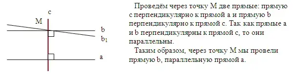 прямой, проходит только одна прямая, параллельная данной». Это и есть аксиома параллельных прямых. Отсюда видно, что рассмотренная выше задача имеет единственное решение.