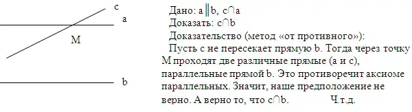 Пусть прямые а и с не параллельны. Тогда они пересекаются в некоторой точке М. Через точку М проходят две различные прямые (а и с), параллельные прямой b. Это противоречит аксиоме параллельных.