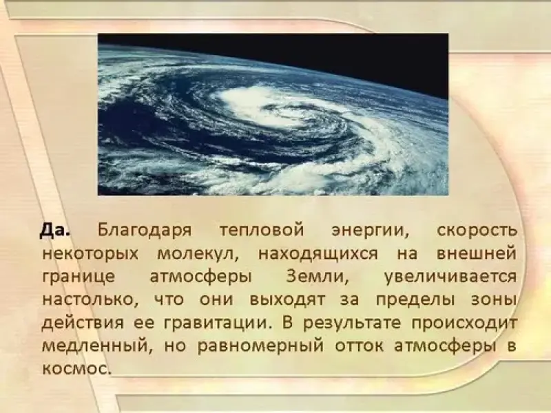 Ответ: Да. Благодаря тепловой энергии, скорость некоторых молекул, находящихся на внешней границе атмосферы Земли, увеличивается настолько, что они выходят за пределы зоны действия ее гравитации. В результате происходит медленный, но равномерный отток атмосферы в космос. Из-за того, что летучий водород имеет более низкую молекулярную массу, его молекулы легче развивают необходимую скорость, и "утекают" в космос быстрее. Поэтому в настоящее время атмосфера Земли не уменьшается, а окисляется, влияя на химическую природу жизни, сформировавшейся на планете. К тому же, атмосфера, насыщенная кислородом, сохраняет уцелевший водород, заключая его в молекулы воды.