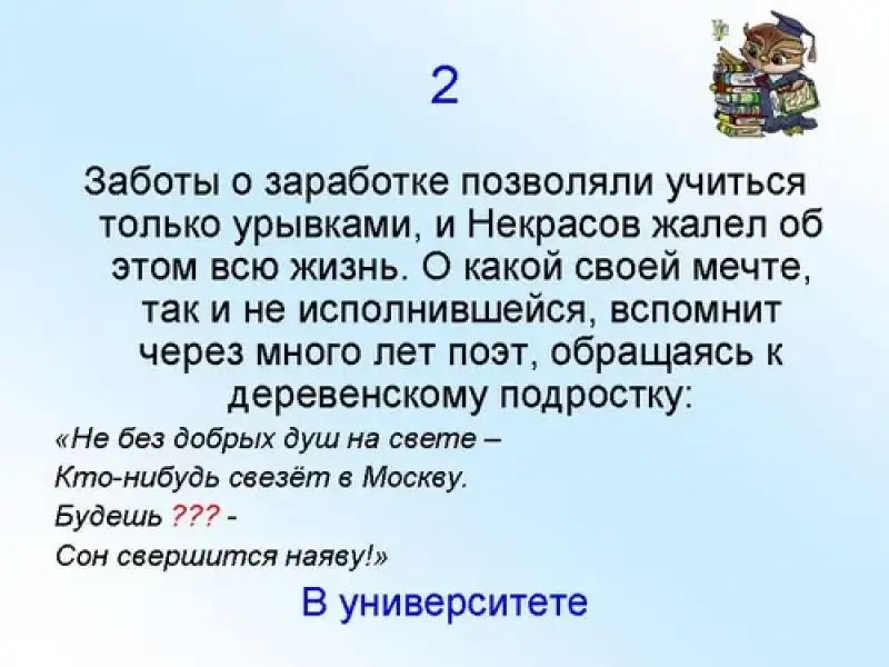2. Заботы о заработке позволяли учиться только урывками, и Некрасов жалел об этом всю жизнь. О какой своей мечте, так и не исполнившейся, вспомнит через много лет поэт, обращаясь к