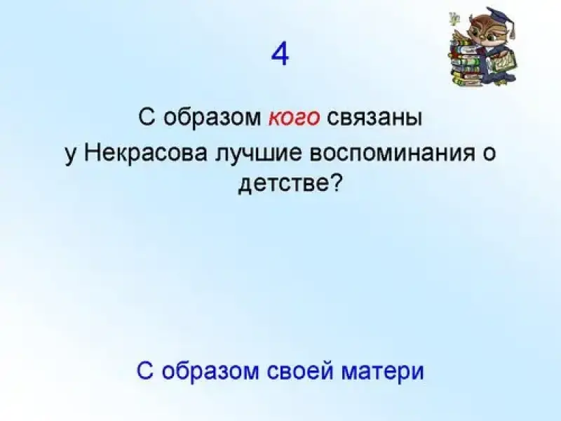 | 4. С образом кого связаны у Некрасова лучшие воспоминания о детстве? | С образом своей матери |