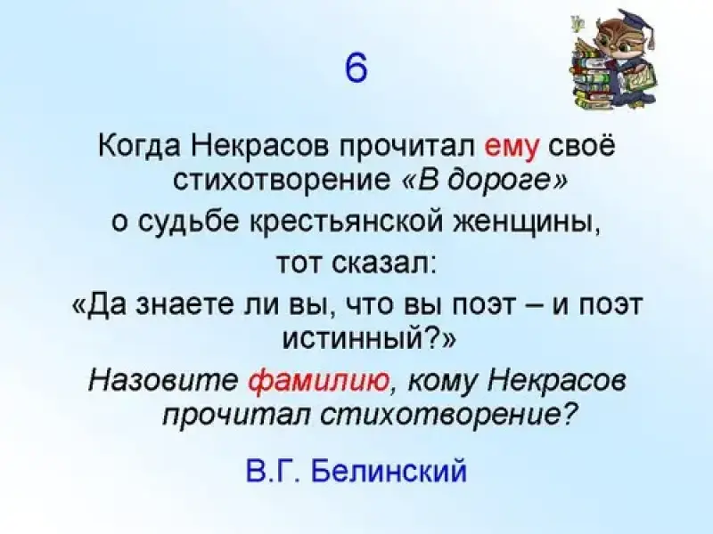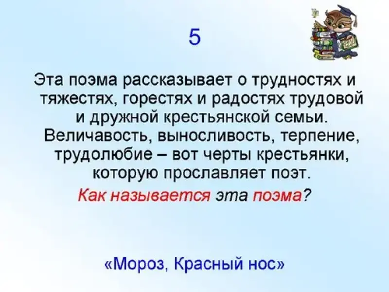 | 5. Эта поэма рассказывает о трудностях и тяжестях, горестях и радостях трудовой и дружной крестьянской семьи. Величавость, выносливость, терпение, трудолюбие - вот черты крестьянки, которую прославляет поэт. Как называется эта поэма? | "Мороз, Красный нос" |
