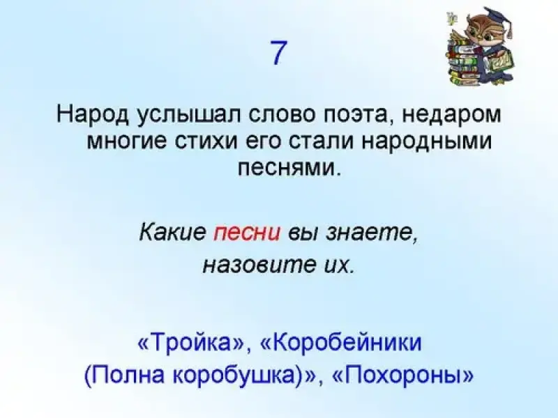 | 7. Народ услышал слово поэта, недаром многие стихи его стали народными песнями. Какие песни вы знаете, назовите их. | "Тройка", "Коробейники (Полна коробушка)", "Похороны" |