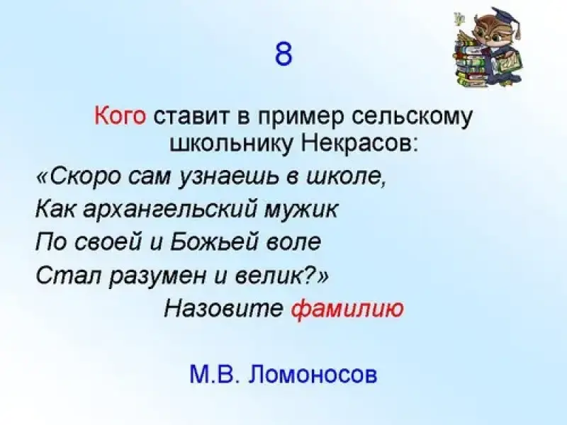 8. Кого ставит в пример сельскому школьнику Некрасов: