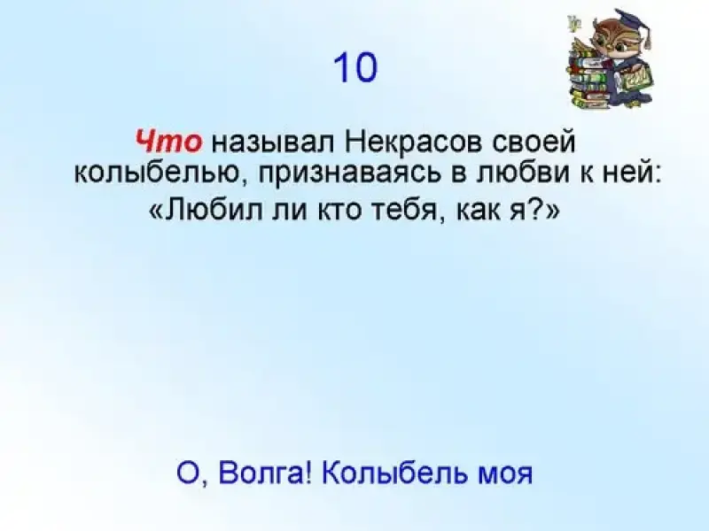 | 10. Что называл Некрасов своей колыбелью, признаваясь в любви к ней: "Любил ли кто тебя, как я?" | О, Волга! Колыбель моя |
