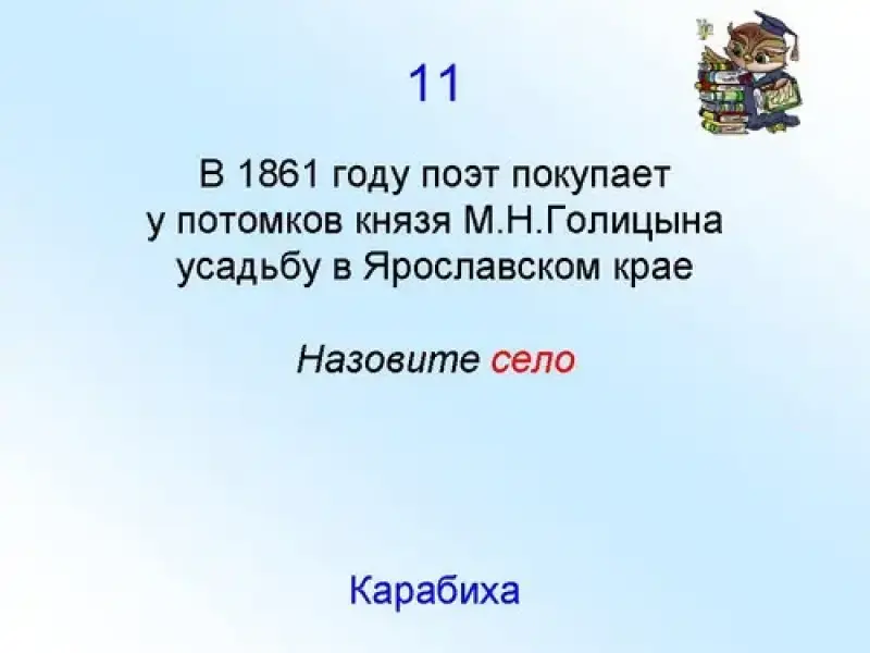 | 11. В 1861 году поэт покупает у потомков князя М.Н.Голицына усадьбу в Ярославском крае. Назовите село | Карабиха |