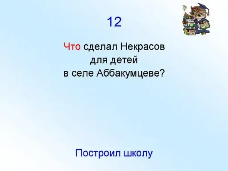 | 12. Что сделал Некрасов для детей в селе Аббакумцеве? | Построил школу |