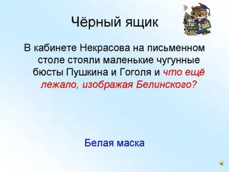 | 9. В кабинете Некрасова на письменном столе стояли маленькие чугунные бюсты Пушкина и Гоголя и что ещё лежало, изображая Белинского? | Белая маска |
