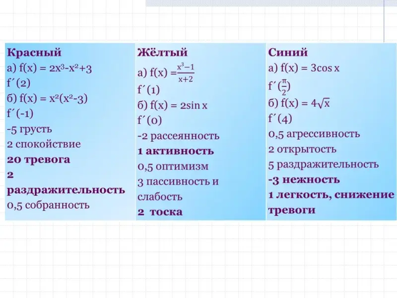 a) f(x) = f´(1) б) f( x) = 2 f´(0) -2 рассеянность 1 активность 0,5 оптимизм 3 пассивность и слабость2 тоска |