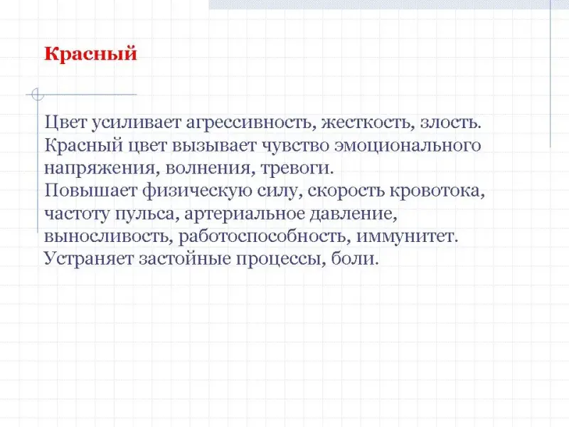 Энергия красного цвета улучшает аппетит, волю, ускоряет темп мышления, повышает работоспособность, выносливость. Цвет усиливает агрессивность, жесткость, злость. Красный цвет может вызвать чувство эмоционального напряжения, волнения, тревоги.