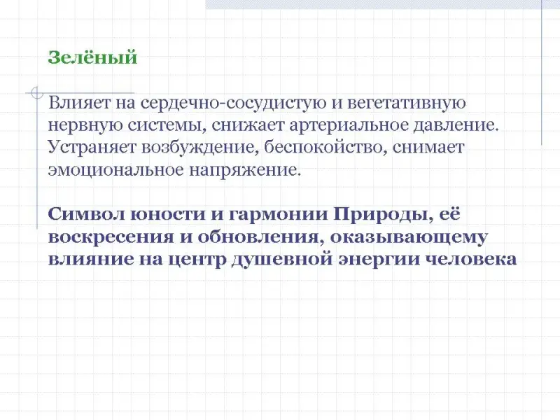 Зелёный цвет: Влияет на сердечно-сосудистую и вегетативную нервную системы, сердцебиение, аритмию, снижает артериальное давление. Устраняет возбуждение, беспокойство, снимает эмоциональное напряжение. При отсутствии зелёного цвета повышается возбудимость, нервозность, раздражительность, усиливается злость, гнев, подозрительность.