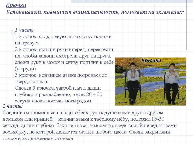 Прежде, чем приступать к ответам на вопросы теста, покрутите головой, найдите на стенах класса понравившийся тренажёр для глаз, пройдите глазками по стрелкам 3 - 5 раз. Не забывайте делать похожие упражнения дома во время выполнения домашней работы, работой за компьютером или просмотром телевизора. Не забывайте постоянно следить за своей «царственной» позой и дома, и на улице. А сейчас сделаем массаж межбровной точки или пальчиков и приступим к ответам на вопросы теста.