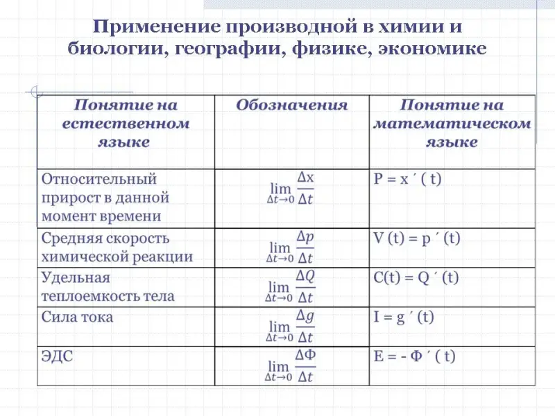 На предыдущих уроках мы выводили табличные производные, доказывали правила дифференцирования и учились практическому применению. Сегодня мы должны повторить производные, правила дифференцирования, закрепить навык их нахождения, дополнить таблицу производных и увидеть широкое применение производной в других науках (слайды 3, 4)