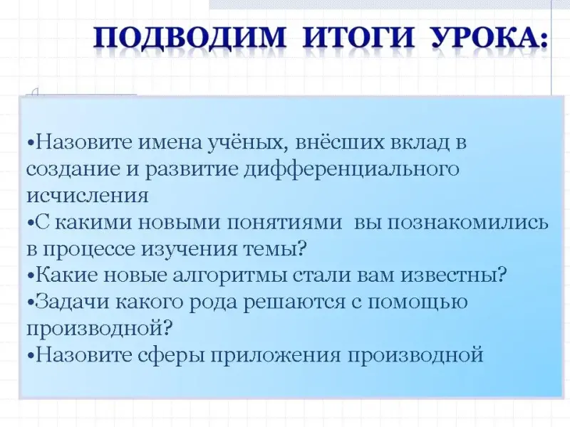 Итак: наш урок подходит к концу. Мы с вами повторили формулы производных, правила дифференцирования, вывели новые формулы.