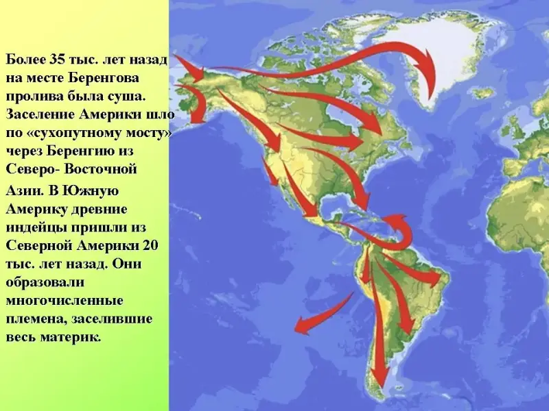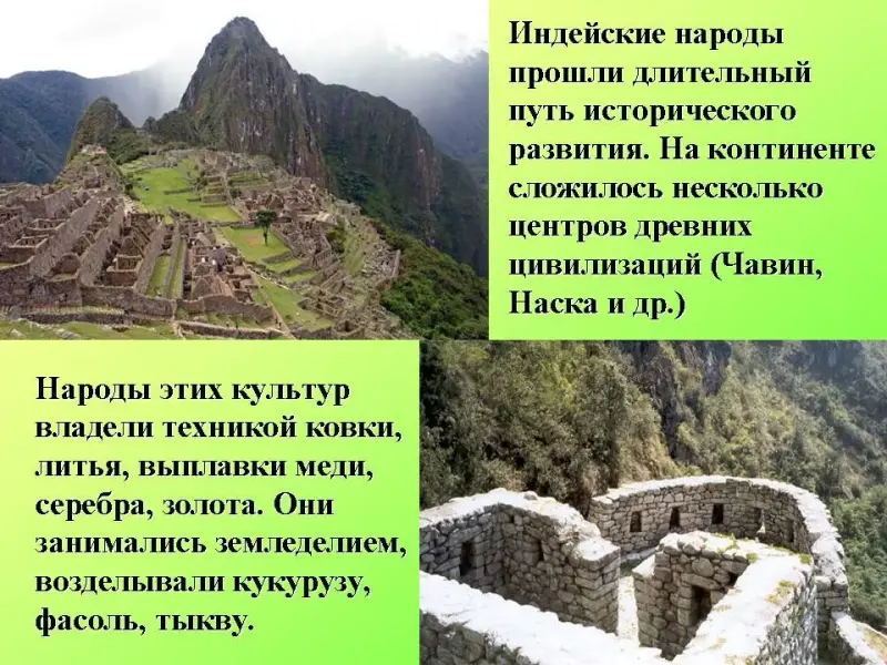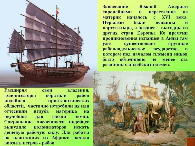 Мы начинаем путешествие во времени. Слайд 5 Мотивация урока: На территории Южной Америки не найдено ископаемых стоянок первобытных людей, нет здесь и останков человекообразных обезьян. Как же человек проник в пределы Южной Америки? Более 35 тыс. лет назад на месте Берингова пролива была суша. Заселение Америки шло по «сухопутному мосту» через Беренгию из Северо-Восточной Азии. В Южную Америку древние индейцы пришли из Северной Америки почти 20 тыс. лет назад. Они образовали многочисленные племена, заселившие весь материк. Слайд 6. Индейские народы прошли длительный путь исторического развития. На континенте сложилось несколько центров древних цивилизаций (Чавин, Наска и др.). Народы этих культур владели техникой ковки, литья, выплавки меди, серебра, золота. Они занимались земледелием, возделывали кукурузу, фасоль, тыкву. Слайд 7 Завоевание Южно Америки европейцами и переселение их на материк началось с 16 века. Первыми были испанцы и португальцы, а позднее - выходцы из других стран Европы. Ко времени проникновения испанцев в Анды там уже существовало крупное рабовладельческое государство, в котором под началом племени инков было объединено не менее ста различных индейских племен. Расширяя свои владения, колонизаторы обратили в рабов индейцев приатлантических областей, частично истребили их или оттеснили вглубь материка на неудобные для жизни земли. Сокращение численности индейцев вынудило колонизаторов искать дешёвую рабочую силу. Для работы на плантациях из Африки начали ввозить негров-рабов. |