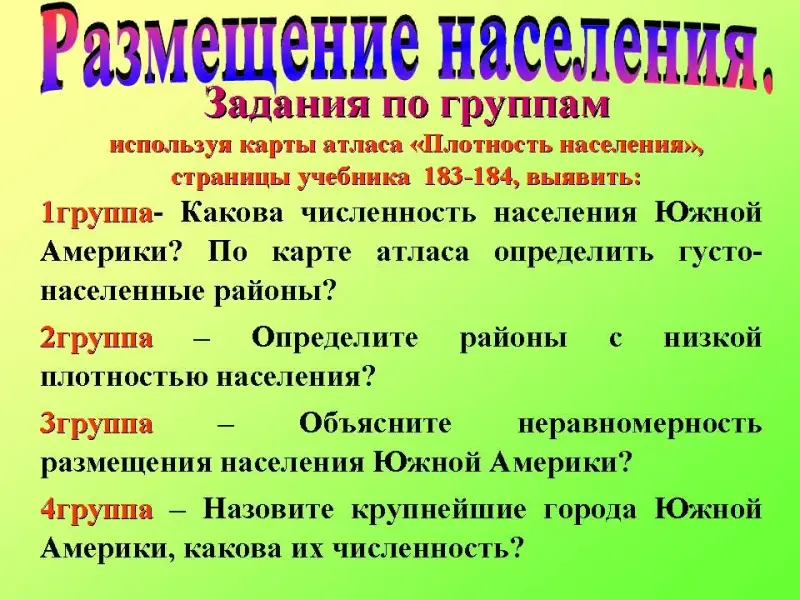 Задания по группам. Используя карты атласа «плотность населения», учебник стр. 183-184 выявить: 1 гр. Численность населения Южной Америки? Густонаселенные районы. 2 гр. Районы с низкой плотностью населения. 3 гр. Объясните неравномерность размещения населения Южной Америки. 4 гр. Назовите крупнейшие города Южной Америки. Какова их численность? Покажите их на карте. Слайд 13 Города Южной Америки. |