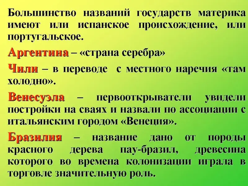Политическая карта Южной Америки. Задания по группам. 1 гр. Назовите самые большие по площади государства. 2 гр. Назовите страны, не имеющие выхода к морю. 3 гр. Назовите страны расположенные на Тихоокеанском побережье. 4 гр. Назовите страны расположенные на Атлантическом побережье. Слайд 15 По природным особенностям выделяют страны Востока (Бразилия, Аргентина, Уругвай, Парагвай). И андийские страны (Венесуэла, Боливия, Эквадор, Колумбия, Перу, Чили). Слайд 16 Большинство названий государств материка имеют или испанское происхождение, или португальское. Гондурас - «глубина» Никарагуа - имя местного вождя Пуэрто-Рико - «богатый порт» Аргентина - «страна серебра» Чили - в переводе с местного наречия «там холодно» Венесуэла - первооткрыватели увидели постройки на сваях и назвали по ассоциации с итальянским городом «Венеция» Бразилия - название дано от породы красного дерева пау-бразил, древесина которого во времена колонизации играла в торговле значительную роль. |