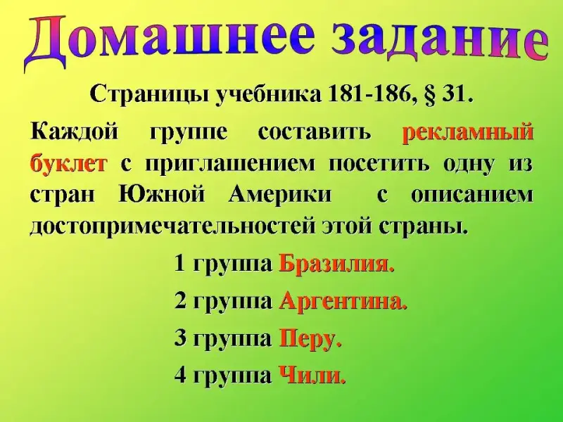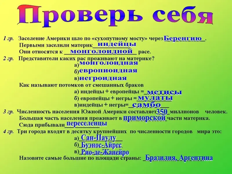 Нанесите на контурную карту страны Южной Америки. Слайд 19 Проверь себя. 1 гр. Заселение Америки шло по «сухопутному мосту» через ___________. Первыми заселили материк __________. Они относятся к _______________ расе. 2 гр. Представители каких рас проживают на материке? А) _______________. Б) _______________. В) _______________. Как называют потомков от смешанных браков: А) индейцы + европейцы = ___________. Б) европейцы + негры = _____________. В) индейцы + негры = ______________ . 3 гр. Численность населения Южной Америки составляет _______ млн. человек. Большая часть населения проживает _____________ части материка. Сюда прибывали ___________. 4 гр. Три города входят в десятку крупнейших по численности городов мира: это ___________, __________, __________. К странам Востока относятся страны: _________, ________, ________, __________. К андийским странам относятся ________, _______, ________, ________, ________, _________. Слайд 20 Домашнее задание. Стр. учебника181-186, 31. Каждой группе составить рекламный буклет с приглашением посетить одну из стран Южной Америки, с описанием достопримечательностей этой страны. 1 гр. Бразилия 2 гр. Аргентина 3 гр. Перу 4 гр. Чили |