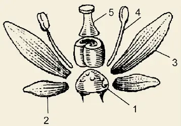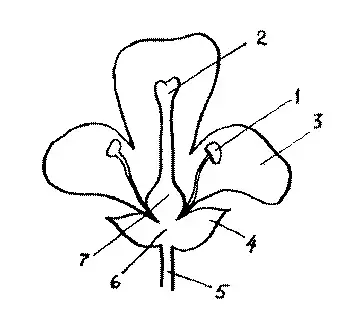 1 - тычинка; 2 - пестик, 3 - венчик (все вместе взятые лепестки); 4 - чашелистики; 5 - цветоножка; 6 - цветоложе; 7 - завязь.